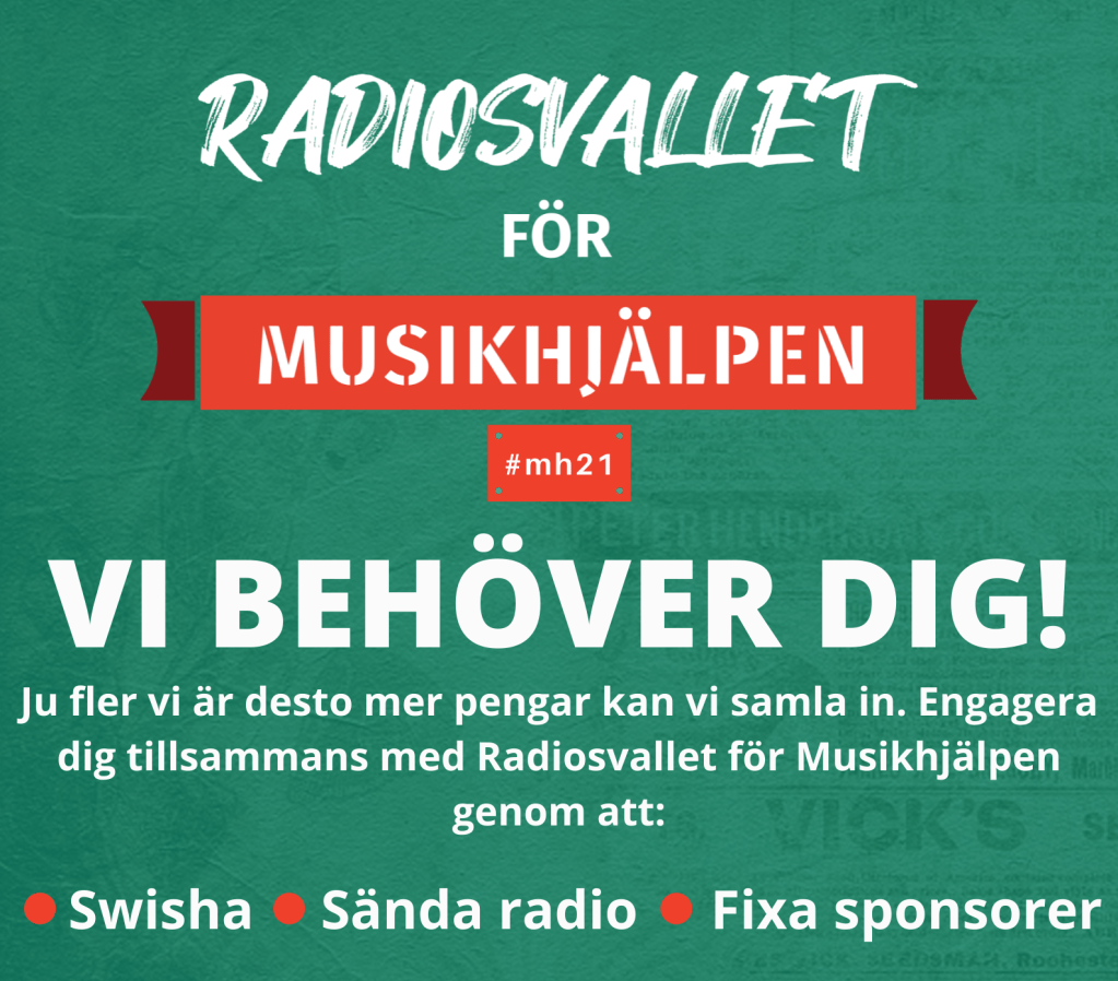 Men! Här ska vi inte hänga läpp. Det kommer bli annorlunda än först tänk, det kommer det. Men vi kommer samla ihop en liten, men stark, grupp som från Mittuniversitetets radiostudio kommer hålla igång sändningen i 24 timmar. Vi kommer få in röster via länk, vi kommer ha utmaningar, vi kommer ha härliga auktioner, och viktigast av allt: vi kommer samla in pengar till Musikhjälpen 2020!